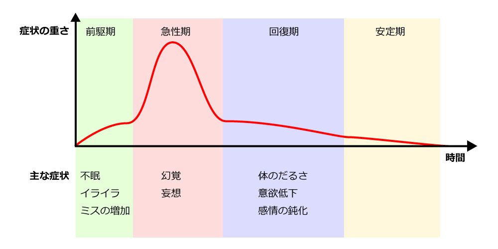 統合失調症の経過は「前駆期」「急性期」「回復期」「安定期」の4つのフェーズに分かれています。